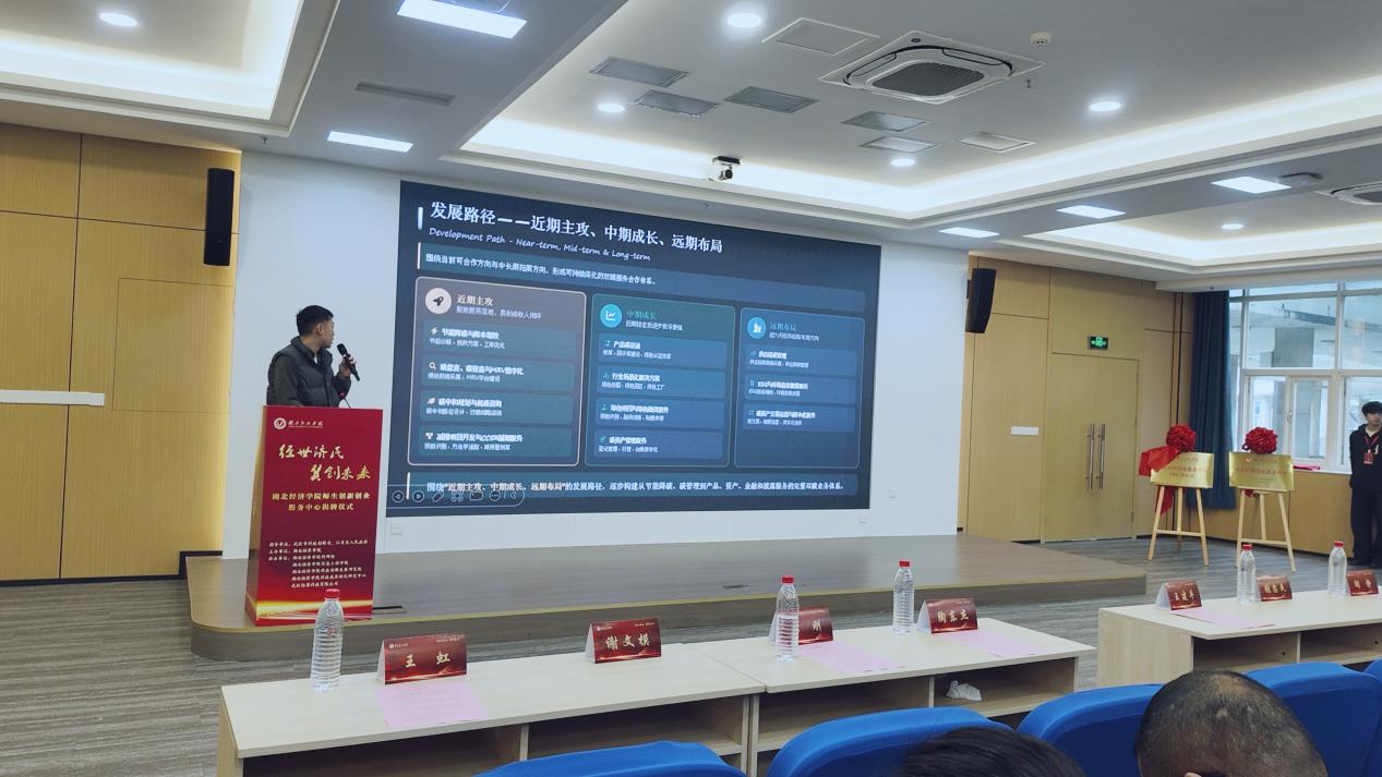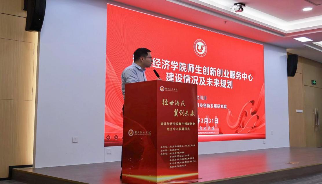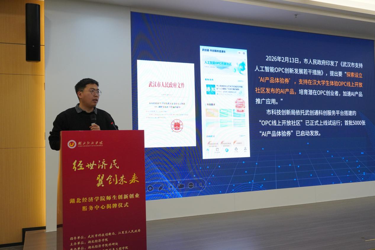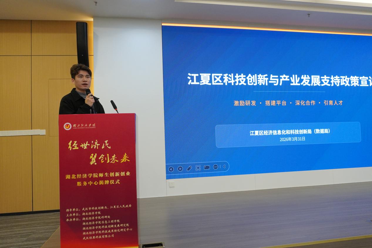 湖北经济学院科技创新发展研究院负责人介绍了师生创新创业服务中心的建设情况、发展思路和未来规划。据介绍,该中心作为武汉市第6家高校师生创新创业服务中心,将聚焦体制机制、服务模式、协同联动三大创新突破,激发师生创新活力;打造线上线下融合服务平台,线上对接省、市级科创服务平台,线下组建专业技术经理人队伍,提供从创意评估到产业落地的全生命周期“保姆式”服务,携手政府、企业和投资机构,围绕数字经济、绿色低碳、低空经济等优势领域,打造全链条双创服务体系,力争到2028年实现累计成果转化50项以上、孵化师生创业企业20家以上。