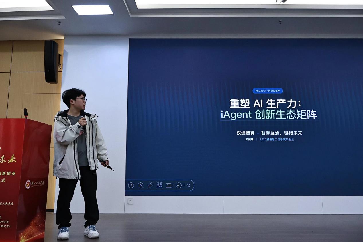 项目路演环节,5个优质师生创新创业项目集中亮相,涵盖绿色低碳、人工智能OPC、智慧健康、低空经济、科技服务五大前沿领域,全面展现学校师生双创硬核实力。中心孵化项目“碳经智感”以人工智能技术助力低碳发展,OPC社区项目“汉通智算”打造智能化算力应用服务平台,校企合作项目“豆听科技”以AI赋能听力健康产业,科技成果转化项目“翼飞智能”抢抓低空经济风口服务城市治理,师生共创项目“经翼科技”搭建科技成果转化全链条智慧服务平台。从教师领衔的科研成果转化,到校友创业的反哺实践,再到校企协同的产业探索,一个个优质项目成为学校师生双创工作和科技成果转化工作的生动缩影,也彰显了学校服务区域产业发展的坚实能力。